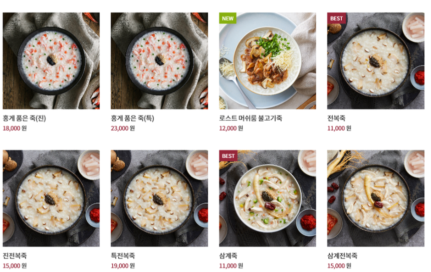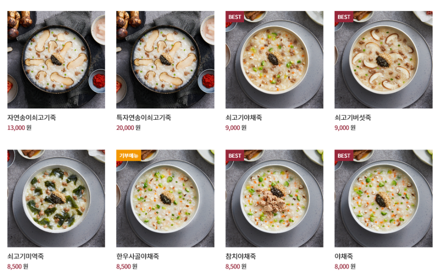전복죽 12,000원 / 전복 내장죽 14,000원 트러플 전복죽 16,000원 / 천연송이버섯 쇠고기죽 14,000원 홍게죽 13,000원 / 능이삼계죽 KRW 삼계 전복죽 15,000원 / 삼계죽 11,000원 불낙지죽 11,500원 / 소고기버섯죽 9,500원 쇠고기 미역죽 9,500원 / 통영 느타리버섯죽 9,500원 새우죽 9,000원 / 해물죽 10,500원 야채죽 7종 9,000원 / 참치 야채죽 9,500원 문어김치죽 10,000원 / 신짬뽕죽 10,500원 으깨기 굴죽 11,000원 / 정품 쇠고기 육개장죽 10,000원 단호박죽 9,500원 / 동지팥죽 9,500원 팥죽 10,000원 / 녹두죽 9,000원