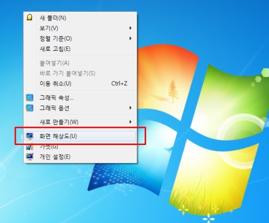 바탕 화면에서 마우스 커서를 누른 상태에서 오른쪽 버튼을 눌러 디스플레이 설정을 누릅니다.